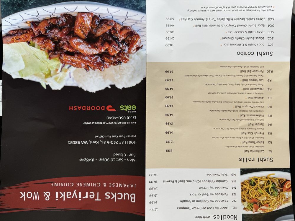 Bucks Teriyaki, a Chinese-Japanese-Sushi Bar located in Kent, WA, offers a diverse menu featuring teriyaki meals, side orders, and combo meals. Customers rave about the generous portions and delicious flavors, with popular dishes like Chicken Teriyaki, Chicken Katsu, and Prawn Teriyaki. The restaurant also provides options for delivery, takeout, reservations, and catering, catering to various dining preferences. The friendly service and quality food have garnered positive reviews from patrons, highlighting the fresh ingredients and ample food portions. With ample parking and a casual yet classy atmosphere, Bucks Teriyaki provides a satisfying dining experience for both individuals and groups. Experience the variety of flavors and exceptional service at Bucks Teriyaki today.